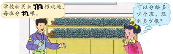 学校新买来m根跳绳,每个班分n根,最多可以分给几个班的同学,还剩多少根?(m>=n)(4.1.9)